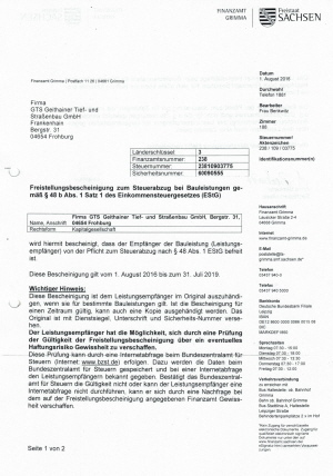 Home Presse / Veröffentlichungen Zertifikate, Bescheinigungen Fachbetrieb nach WHG Freistellungsbescheinigung § 48 Finanzamt Freistellungsbescheinigung § 13 Finanzamt Leistungen Anfahrt